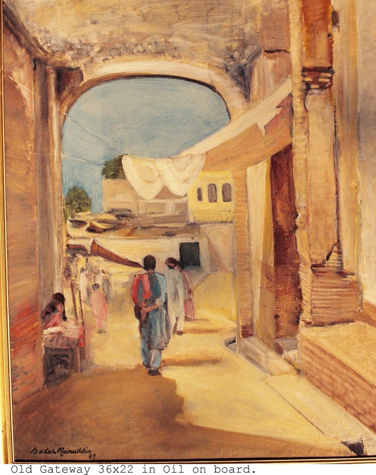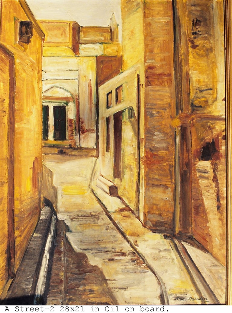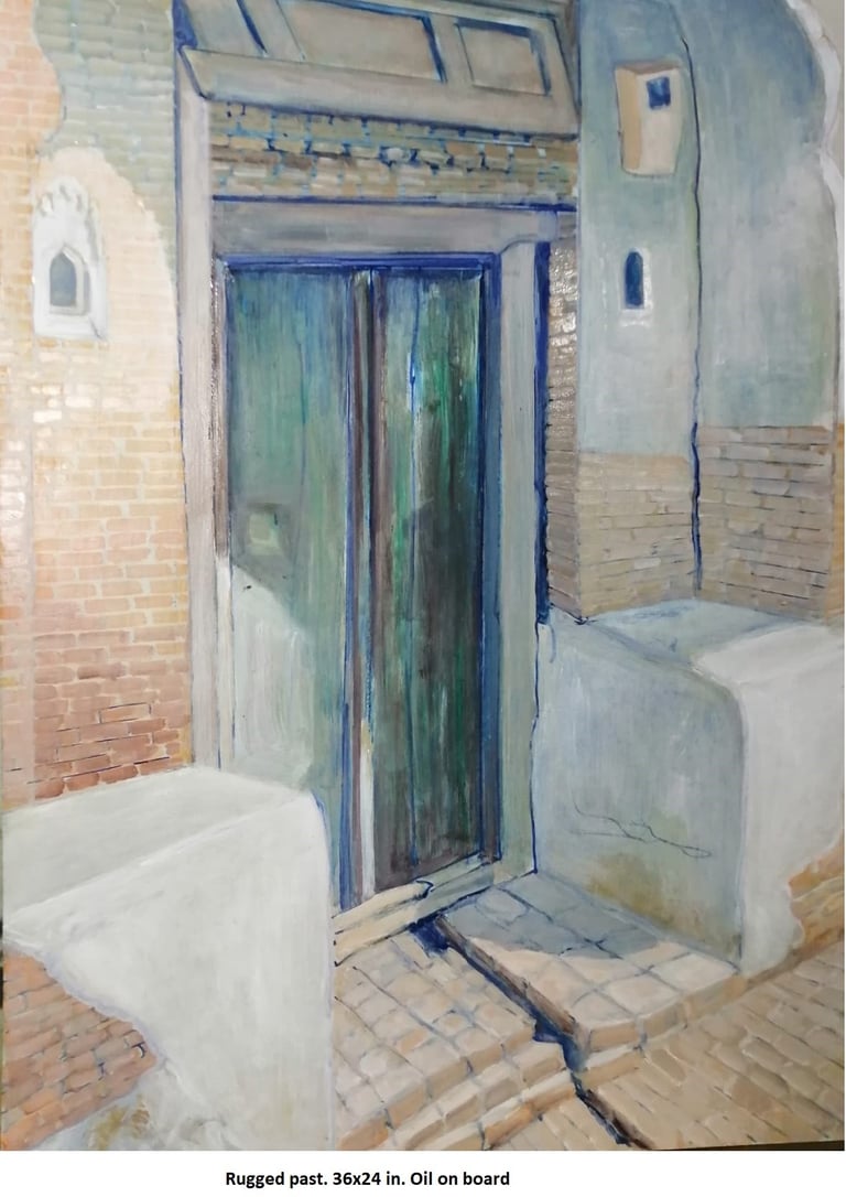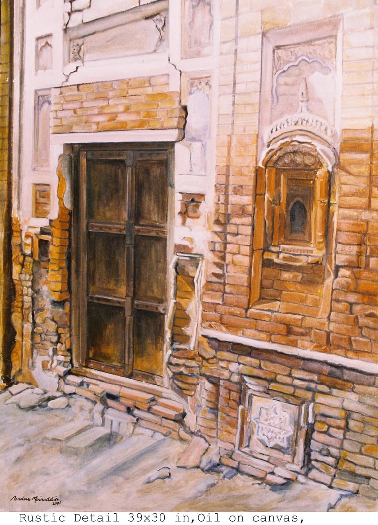 This genre has a special appeal for the artist since his native Pakpattan is an ancient city. Derelict structures, ruins of once graceful houses abound. The high quality craftsmanship still stands out even in their crumbling state.